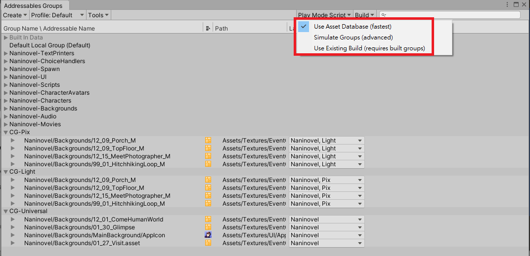 Use Asset Database => Naninovel 會根據目前編輯器上設置的Addressable Group 來執行Editor測試遊戲